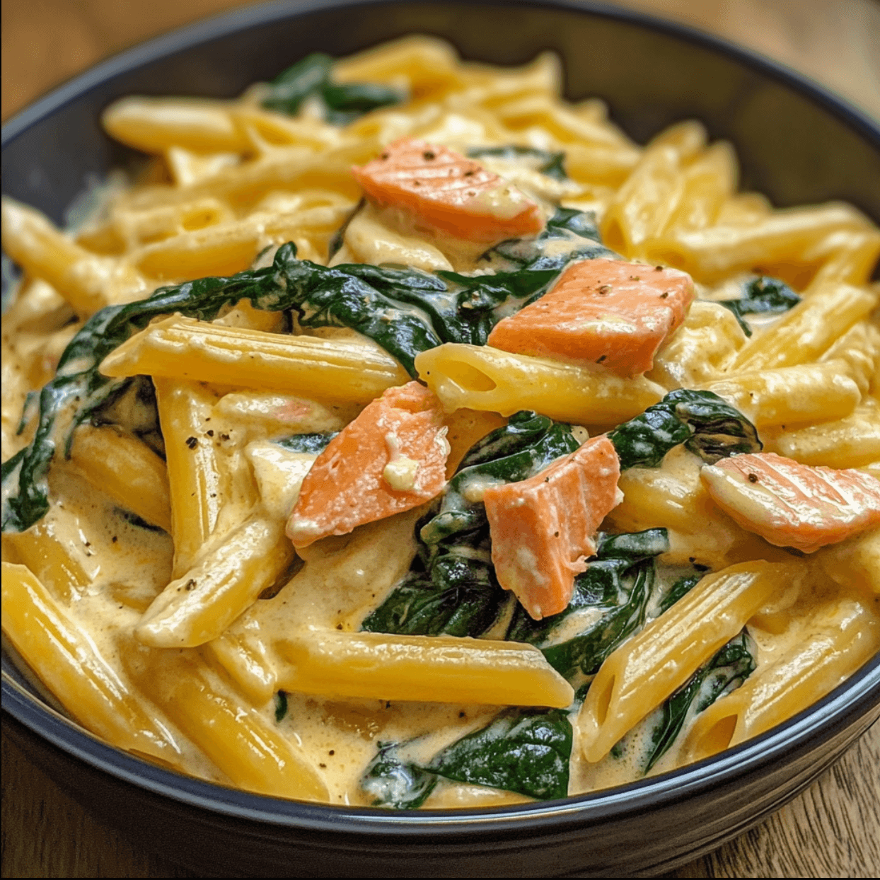Penne mit Lachs-Sahnesoße und Spinat – cremig, raffiniert & einfach