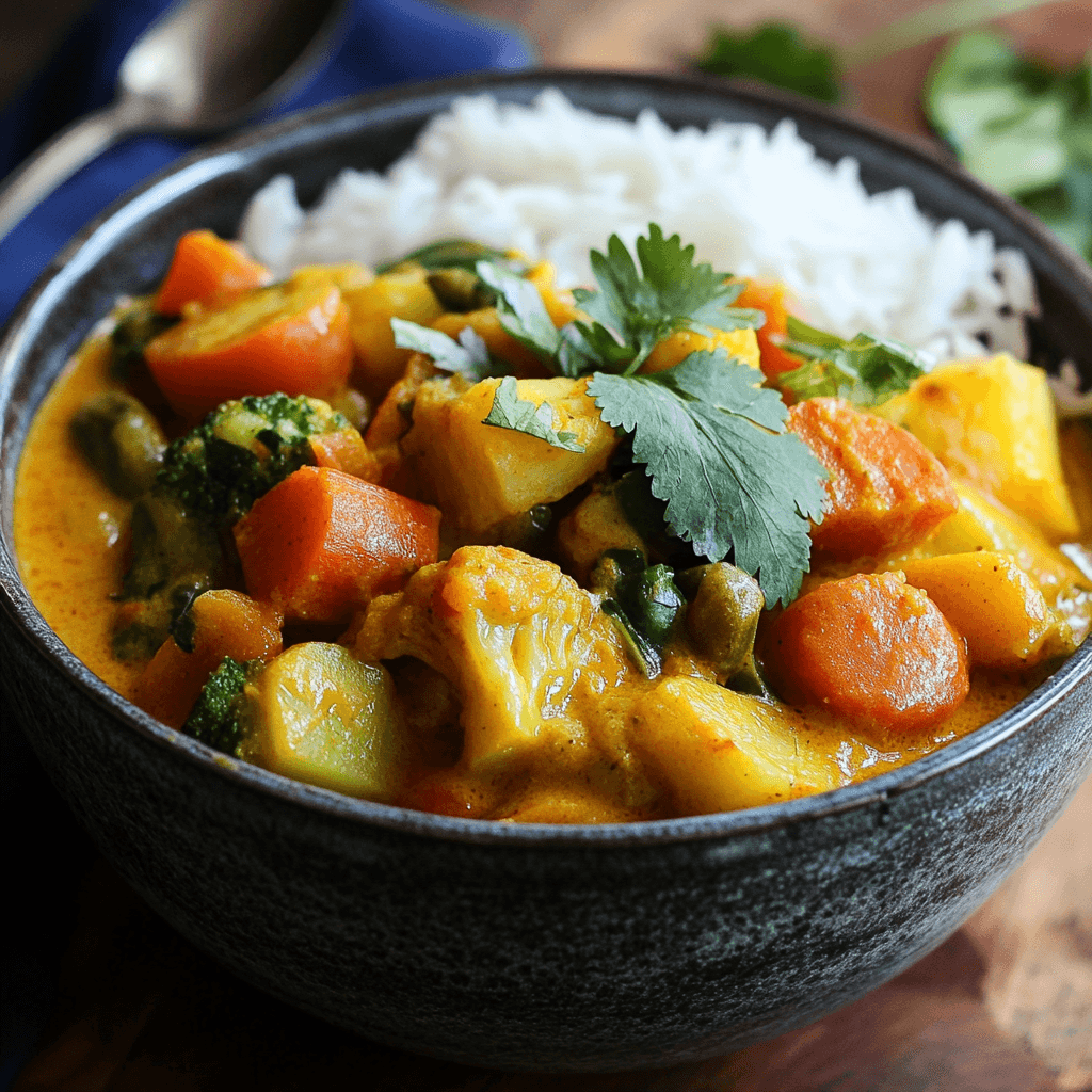 Dieses reichhaltige und aromatische Gemüse-Curry mit Kokosmilch ist ein wärmendes Gericht voller bunter Gemüsesorten, duftender Gewürze und cremiger Kokosmilch. Perfekt für eine gesunde, sättigende Mahlzeit! Das Curry ist vegan, glutenfrei und einfach zuzubereiten. Serviere es mit Reis oder Naan für ein vollständiges Geschmackserlebnis.